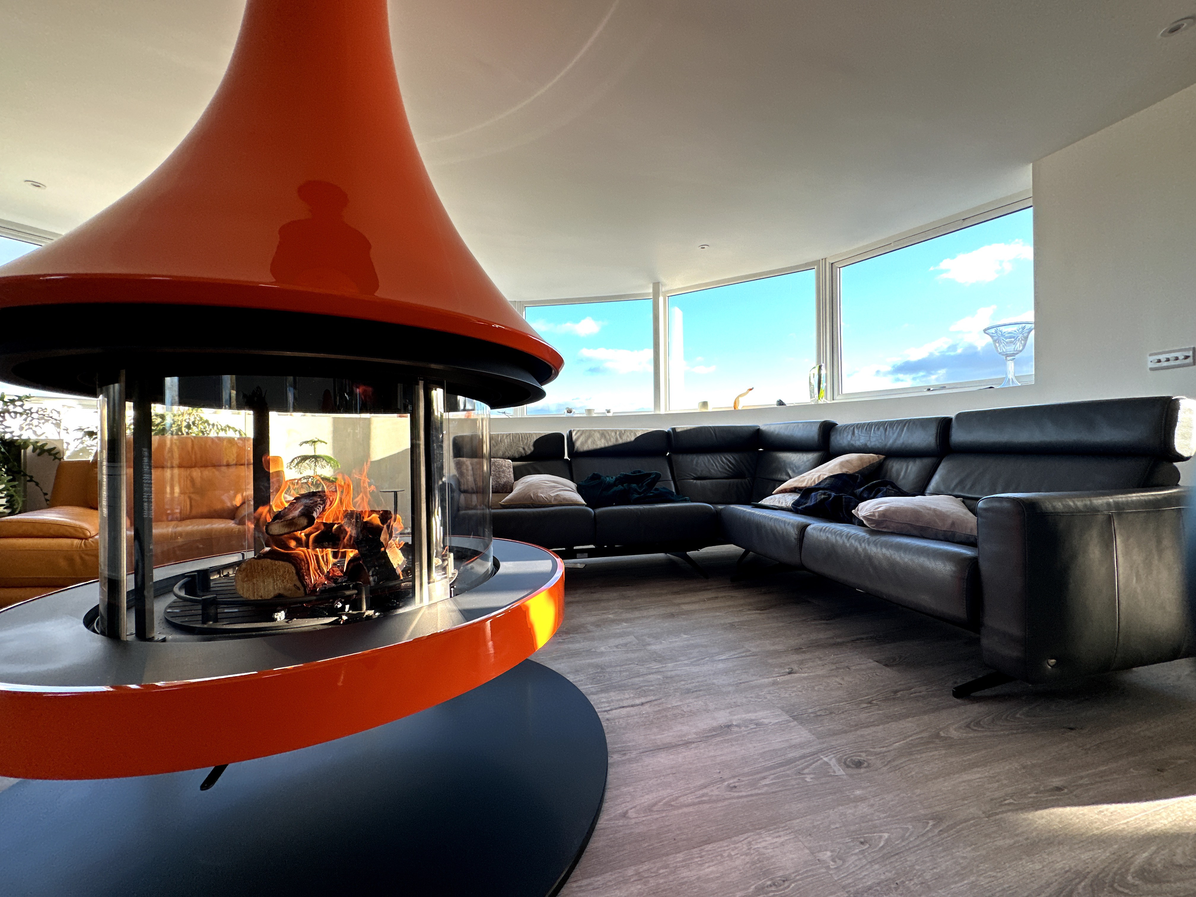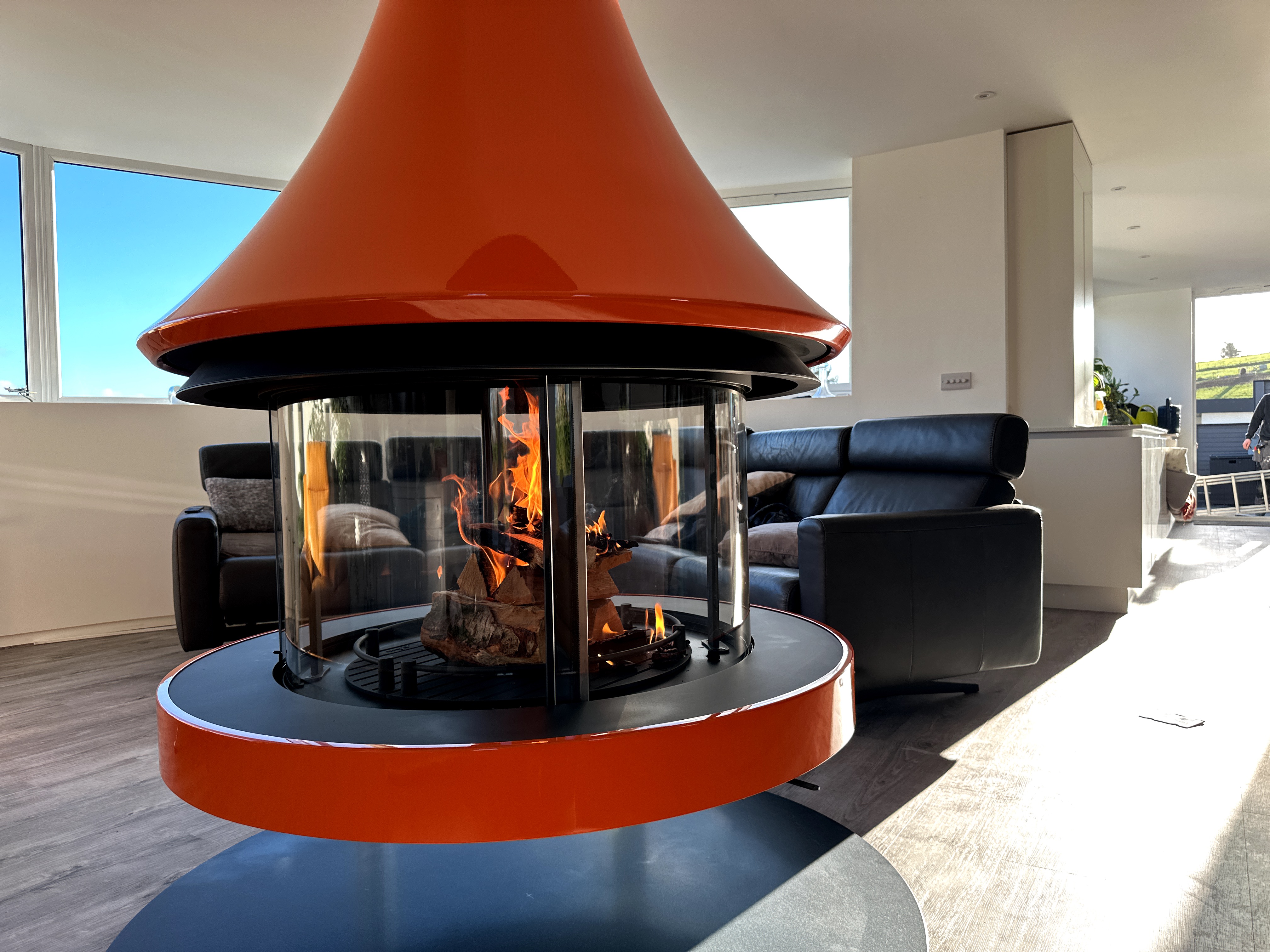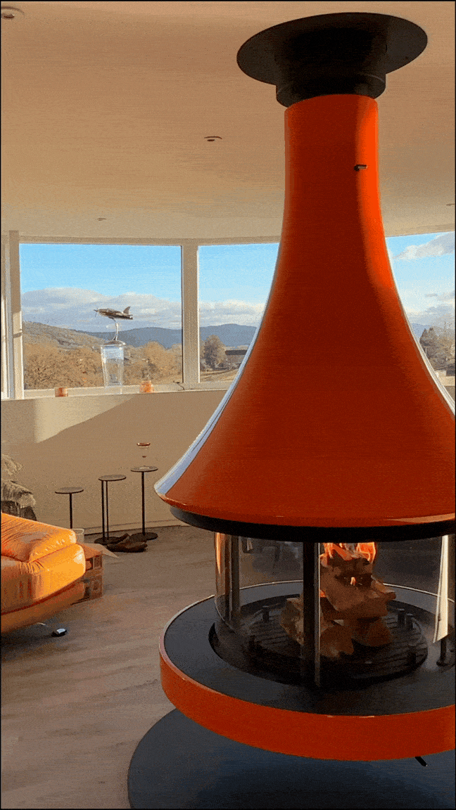 The space was designed for the fireplace to suspend right in the centre of the room, with colourful furniture surrounding the stunning orange fireplace, making for a warm space to unwind in the evenings, with a view overlooking the local scenery.