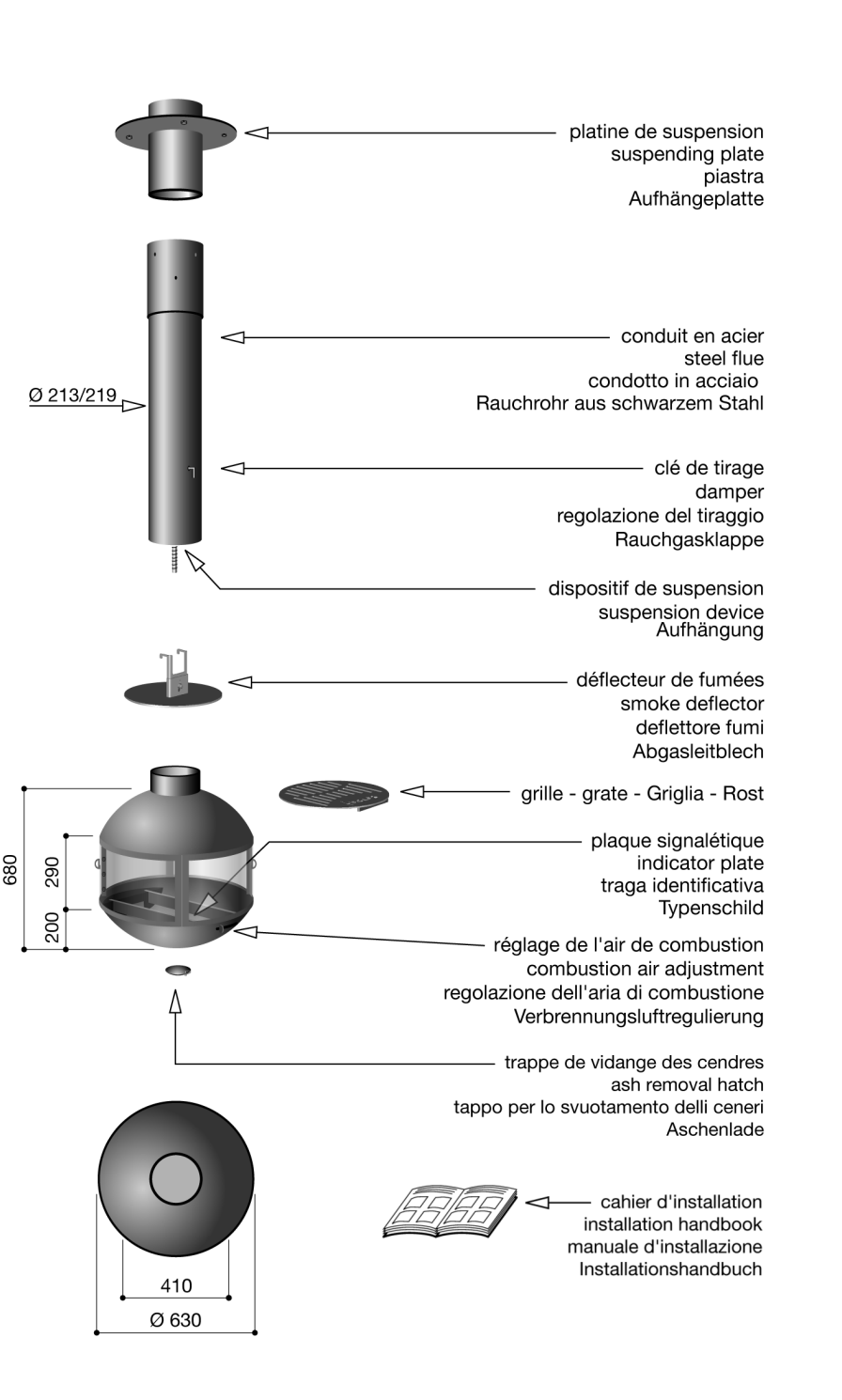 Characteristics: Agorafocus630 is a round fireplace suspended with natural ventilation from the ceiling. Due to its size, a diameter of 24-¾”, it takes up relatively little space. A popular design, Agorafocus630 comes both as an adjustable direction suspended fireplace or a fixed based.