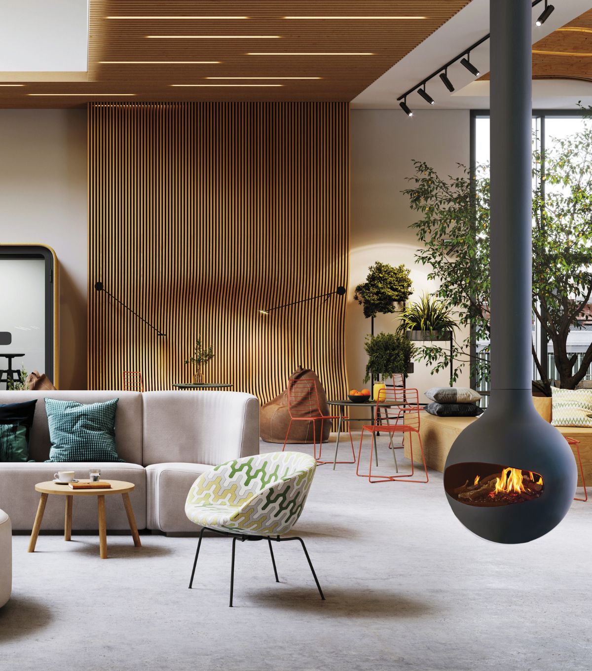 A ceiling suspended fireplace quite literally reinvents how the space is utilised and in doing so, provides not only an ambient level of warmth to the whole room but a striking focal piece too.