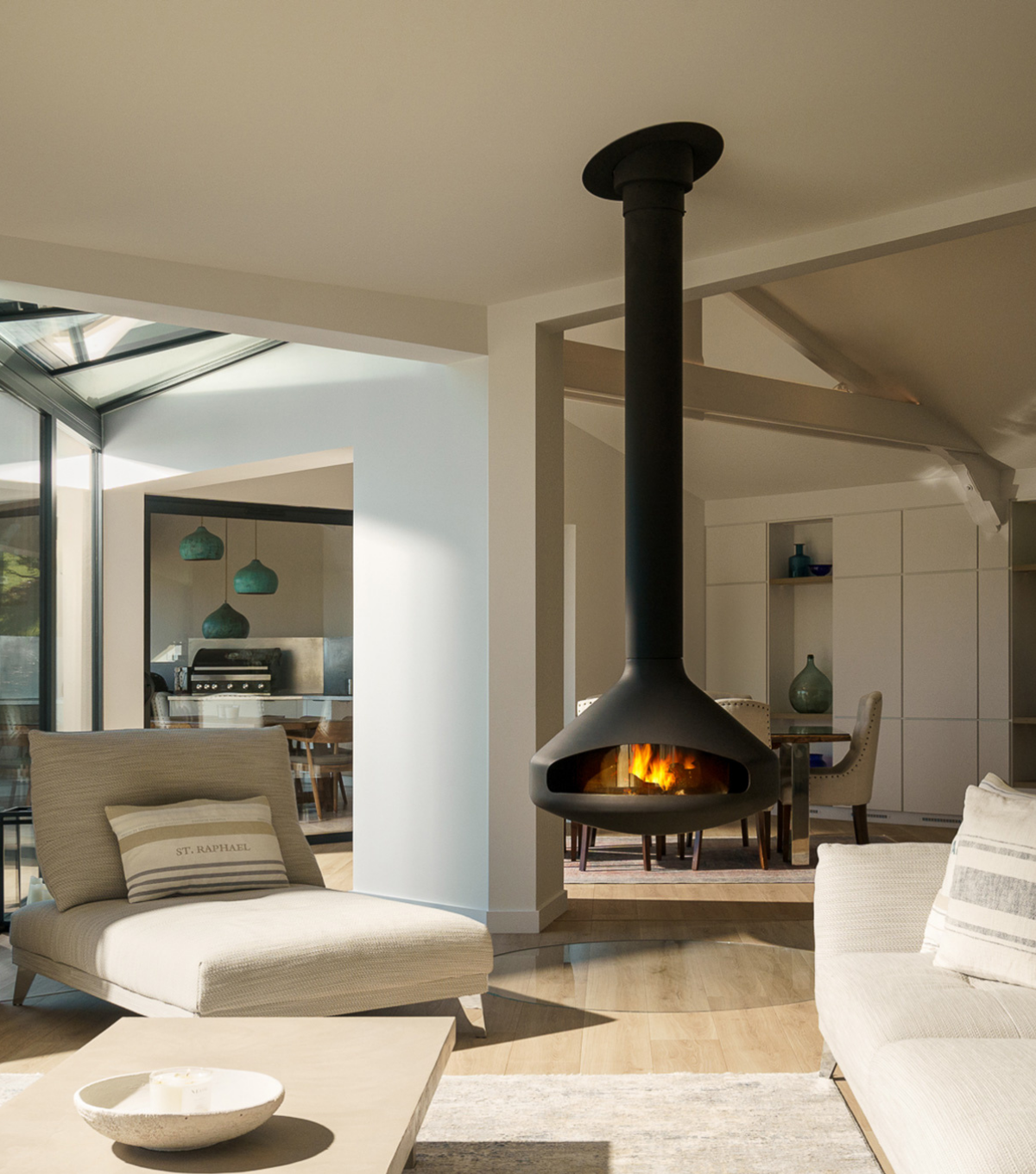 A ceiling suspended fireplace quite literally reinvents how the space is utilised and in doing so, provides not only an ambient level of warmth to the whole room but a striking focal piece too.