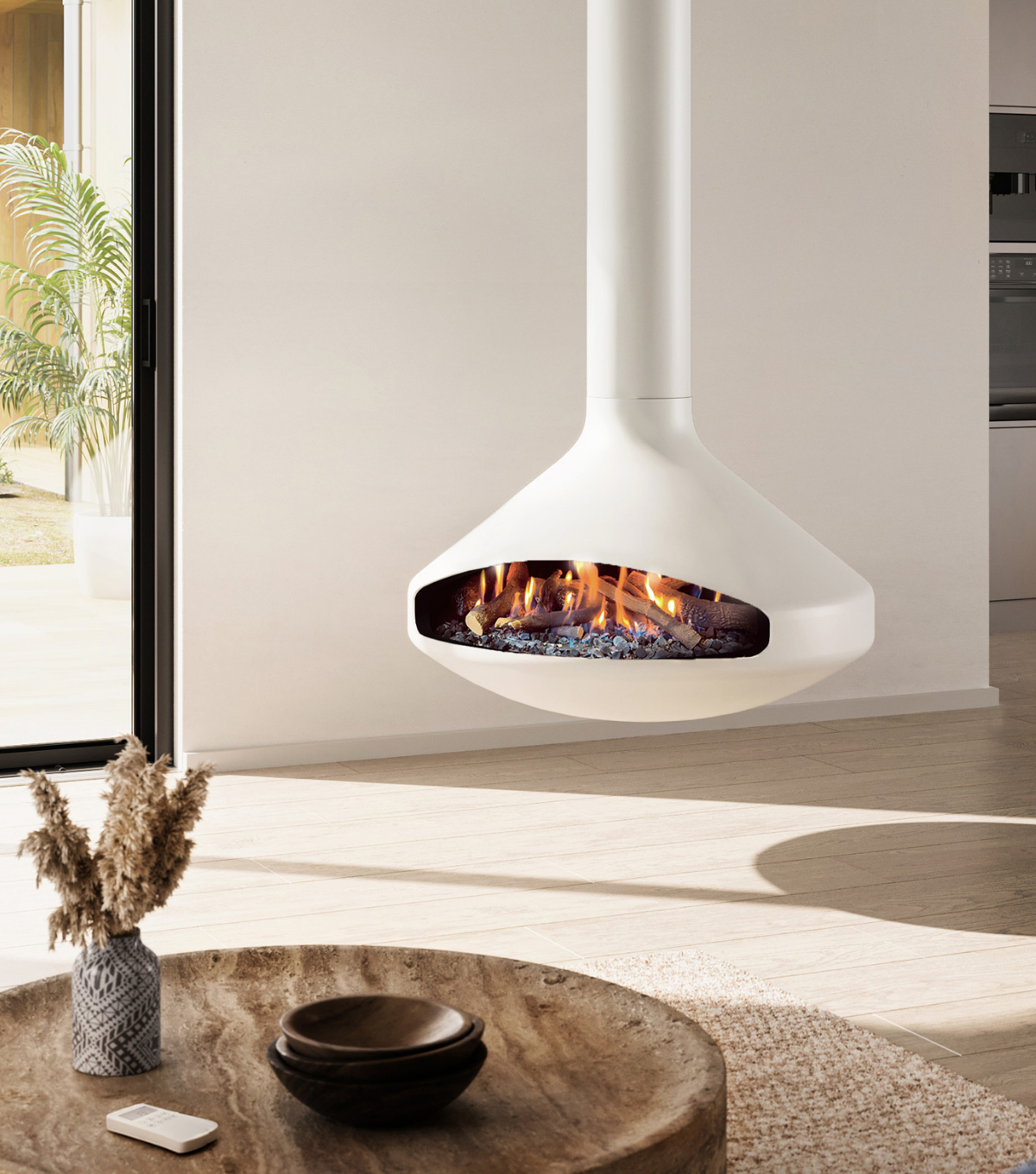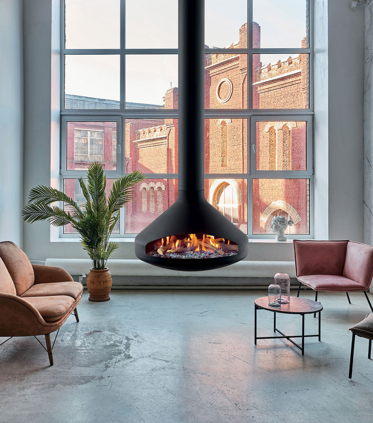 A ceiling suspended fireplace quite literally reinvents how the space is utilised and in doing so, provides not only an ambient level of warmth to the whole room but a striking focal piece too.