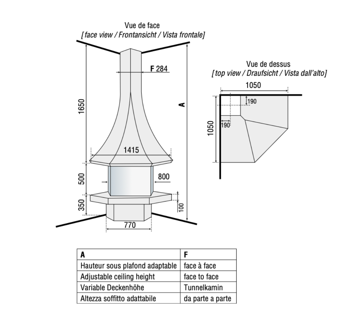 The 985 central fireplace was one of the first designs, however he was not entirely happy with a corner version created simply by cutting a section out. So the hood was completely redesigned to beautifully sit in the corner of a room, with the break in the central connecting line giving this model its unique character. It offers a particularly beautiful view of the wood fire.The suspended version gives the flames a nice height, the large windows allow to see the fire all around this fireplace. The silk-screened windows, from which it gets its "black line" designation, allow a larger view of the flames.