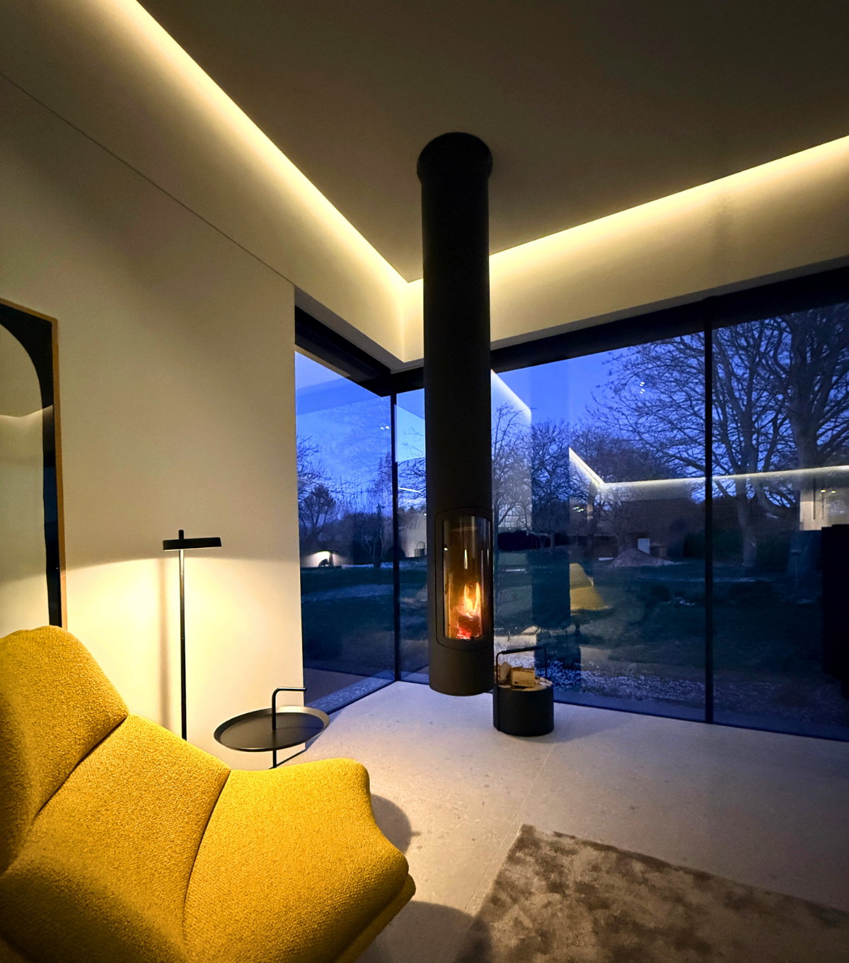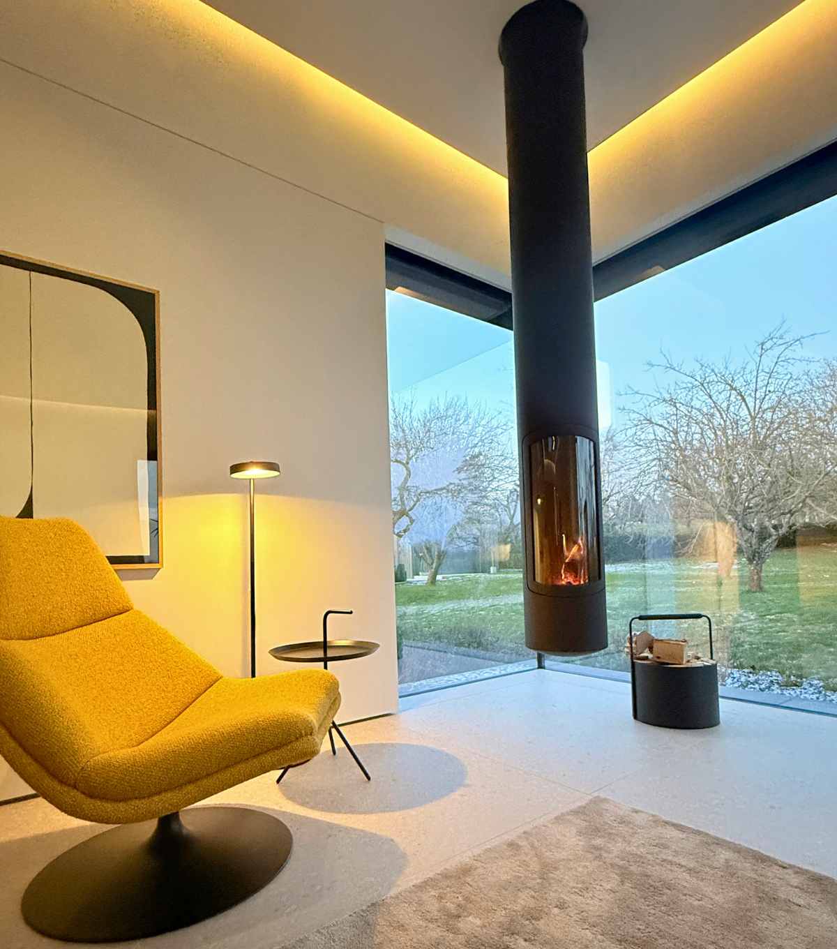A ceiling suspended fireplace quite literally reinvents how the space is utilised and in doing so, provides not only an ambient level of warmth to the whole room but a striking focal piece too.