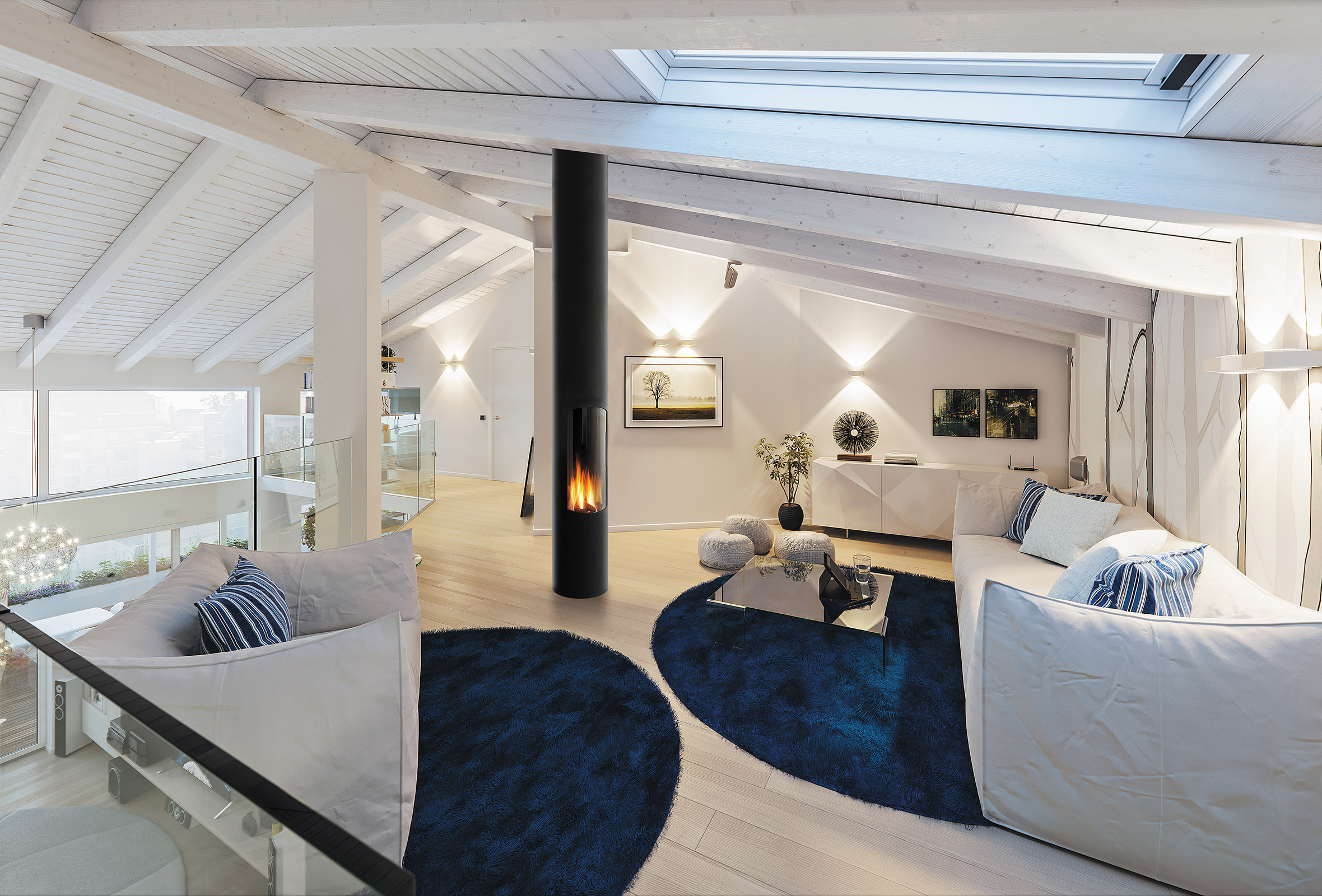 The Slimfocus is a periscope of flames. Its hearth is either suspended (in which case it can pivot) or supported by a base and fixed in place. Its streamlined shape takes up little space, whether it is positioned centrally in a room, near a wall or in a corner.